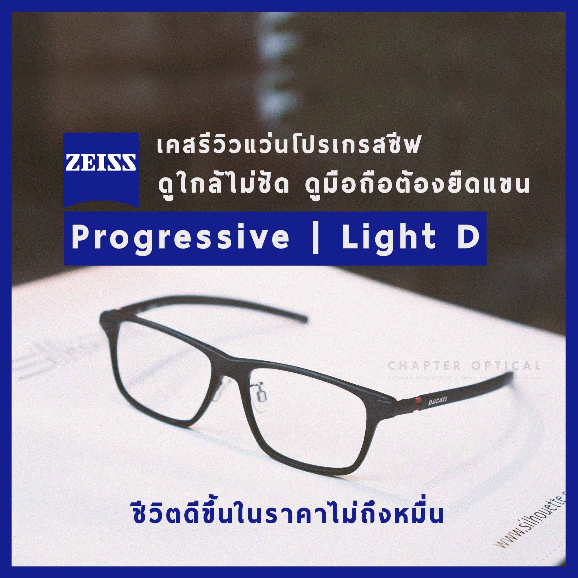 สำหรับท่านใดมีอาการคล้ายกัน มองใกล้เริ่มไม่ชัด ดูมือถือเริ่มมัวต้องยืดแขนออกไป มีอายุช่วง 40-45 ปี สายตายาวไม่เกิน +1.50 ไม่มีสายตาเอียง มองไกลชัดไม่มีค่าสายตา การเลือกใช้แว่นโปรเกรสซีฟของ ZEISS รุ่น Light D ก็เป็นอีกทางเลือกสำหรับท่านที่ต้องการแว่นโปรเกรสซีฟราคาประหยัดในงบประมาณไม่ถึงหนึ่งหมื่นบาทตัวนี้ก็เป็นทางเลือกหนึ่งที่น่าสนใจ คุณภาพเลนส์ยอดเยี่ยม ให้ภาพคมชัด ปรับตัวง่ายสำหรับผู้เริ่มใส่ และยังให้การรับประกันผิวเลนส์ถึง 2 ปีอีกด้วย แต่อย่างไรก็ตามปัจจัยทั้งหมดนี้ก็ควรให้ความสำคัญกับการเลือกกรอบแว่นด้วยเช่นกัน เนื่องจากเลนส์รุ่นนี้ไม่ได้มีความซับซ้อนของเทคโนโลยีมากจึงต้องเลือกกรอบแว่นให้เหมาะสม ต้องใช้ความเชี่ยวชาญของร้านและอาศัยการวัดและดัดแว่นเพื่อให้สอดคล้องกับสเปคของเลนส์ที่ผลิตเพื่อให้ได้การมองเห็นที่สมบูรณ์ที่สุด