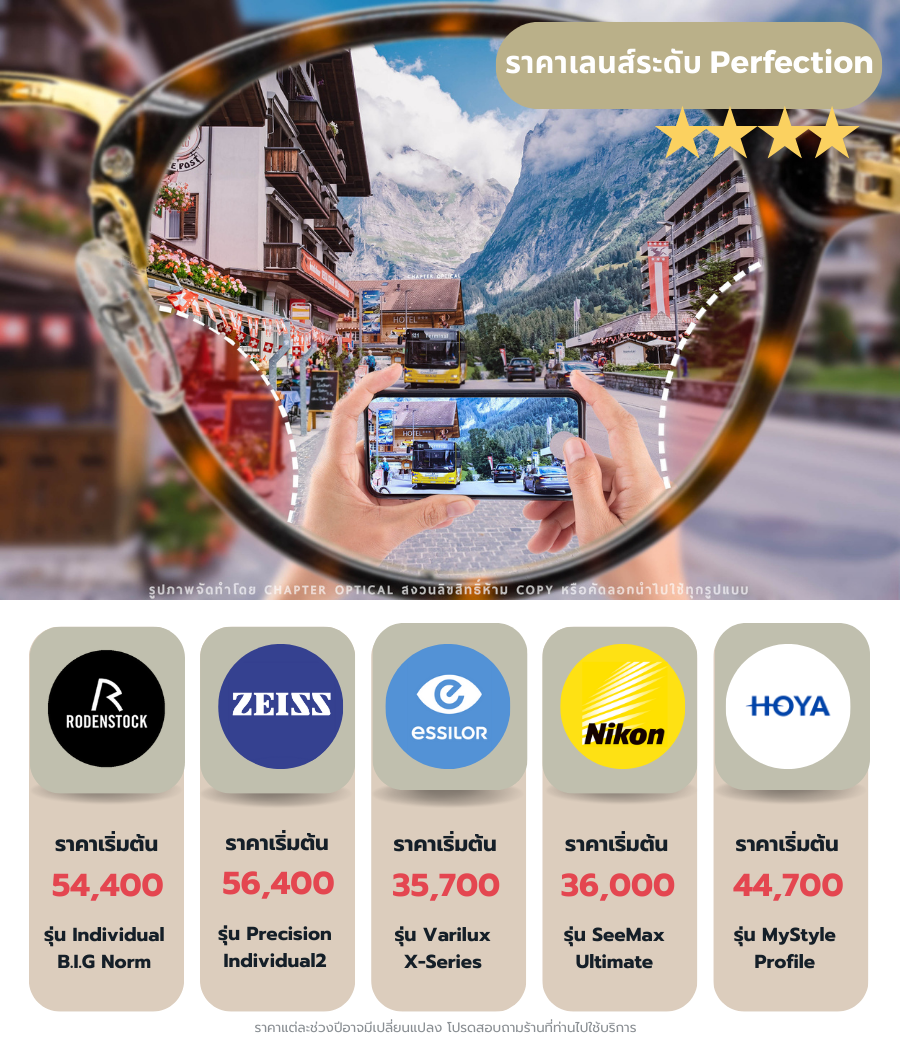 1. ระดับที่หนึ่ง Perfection Series จัดอยู่ในหมวดของโปรเกรสซีฟระดับท็อปสุด ราคาสูงที่สุดและเป็นโปรเกรสซีฟเลนส์ที่มีคุณภาพเยี่ยมที่สุด - ให้การมองเห็นผ่านเลนส์ที่มีมุมมองกว้าง จุดอับสายตาน้อย(หรือแทบไม่มี) - ให้การโฟกัสที่ง่ายกว่า การมองไกลและใกล้ให้ความสมูทสูง ลดอาการวูบวาบได้ดีที่สุด- เหมาะสำหรับผู้ที่ใช้โปรเกรสซีฟเป็นประจำทุกวันและต้องการโปรเกรสซีฟเลนส์ที่ปรับตัวง่ายที่สุด- ใช้ได้ดีกับผู้ที่เคยใช้โปรเกรสซีฟมาแล้วแต่ไม่ประสบความสำเร็จ การเลือกใช้โปรเกรสซีฟเลนส์ในกลุ่ม Perfection เป็นการเลือกใช้เลนส์โปรเกรสซีฟที่ดีที่สุดของค่ายนั้น มั่นใจได้ถึงคุณภาพที่ดีที่สุดของทุกรุ่นรวมไว้กับเลนส์นี้ทั้งหมดแล้ว- เลนส์กลุ่มนี้ หมาะกับอาชีพ นักธุรกิจ, นักเทรด, นักบิน, ทันตแพทย์, วิศวะ , ครู พนักงานบัญชี, พนักงานออฟฟิศ, อื่นๆ เนื่องจากเลนส์ให้ความแม่นยำของค่าสายตาและความแม่นยำในการมองได้สูงราคาโปรเกรสซีฟ เท่าไหร่ สำหรับกลุ่ม Perfection Series (รุ่นท็อป)