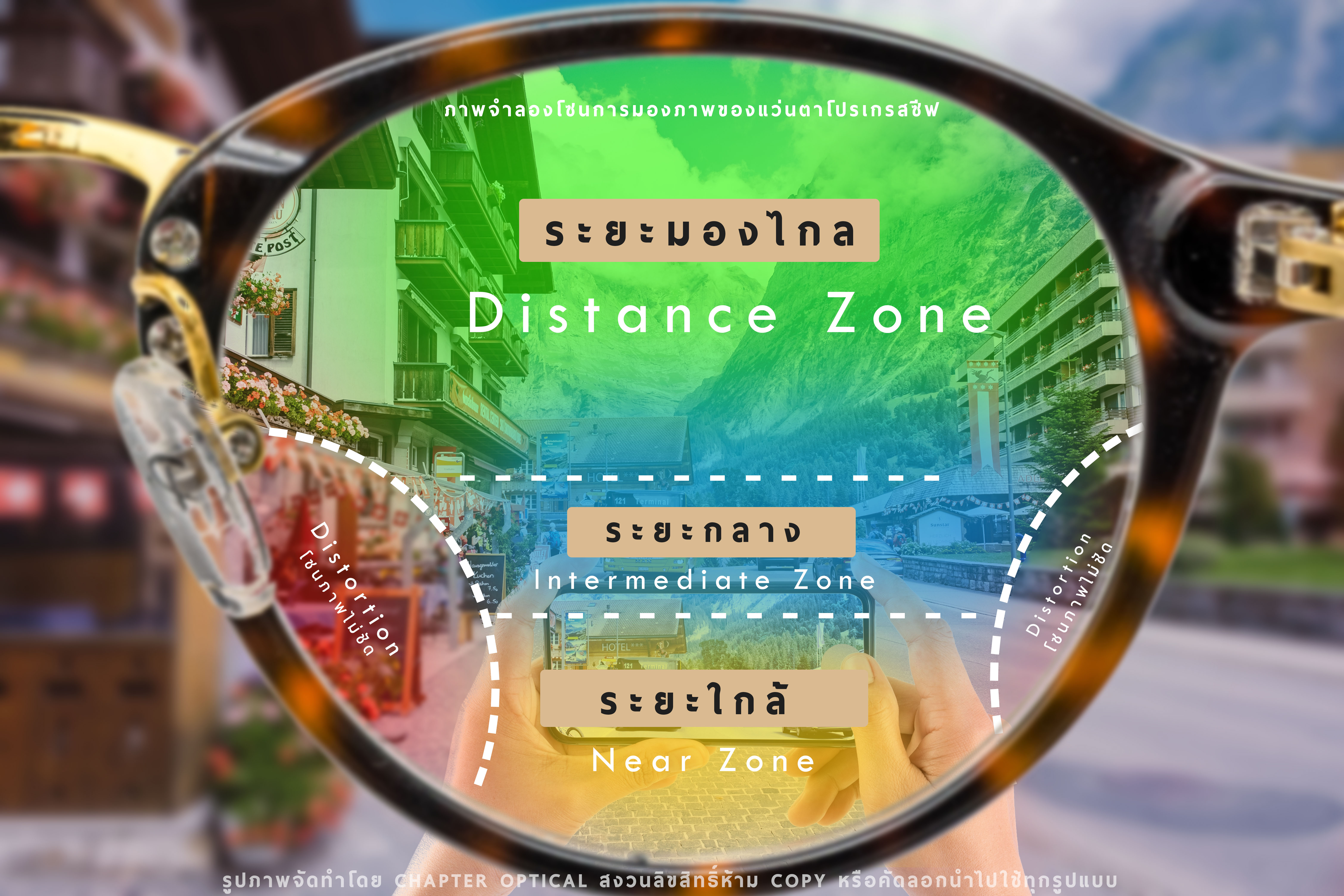 โซนมองไกล(Distance Zone) เมื่อเราสวมแว่นตาตาของเราจะอยู่ในตำแหน่งของ Distance Zone โดยอัตโนมัติ เป็นตำแหน่ง Default ของตาตอนที่เราสวมใส่แว่นเลยก็ว่าได้ เมื่อเรามองตรงแบบไม่เงยหน้าหรือก้มหน้า จะเป็นการมองไกลเช่น ขับรถ, ดูภาพยนต์, ดูทีวี, ปั่นจักรยาน, มองลูกกอล์ฟที่กำลังพุ่งไปข้างหน้า เป็นต้นโซนระยะกลาง(Intermediate Zone) เป็นโซนที่อยู่บริเวณกลางของเลนส์หรือการลดระดับของตาลงเล็กน้อยจะเป็นส่วนของการโฟกัสภาพวัตถุสิ่งของที่อยู่ตรงหน้าในระยะปลายมือเช่น หน้าจอคอมพิวเตอร์, หรือป้ายราคาตามชั้นวางสินค้าในห้างสรรพสินค้าโซนมองใกล้หรือ Near Zone เป็นโซนที่อยู่บริเวณด้านล่างของเลนส์ โดยมีระยะห่างจากตำแหน่งของการมองไกลลดระดับลงมาประมาณ 10-15mm ซึ่งเป็นตำแหน่งที่ท่าทางที่ดีที่สุดเมื่อเรามองมือถือหรืออ่านหนังสือ เป็นตำแหน่งที่ทุกคนจะกวาดตาลงมาแบบอัตโนมัติเมื่อต้องการมองใกล้ ซึ่งจะเป็นการมองผ่าน Near Zone เราจึงมองใกล้อ่านหนังสือหรือเล่นมือถือได้อย่างชัดเจนเนื่องจากโปรเกรสซีฟของแต่ละแบรนด์จะมีรุ่นย่อยมากมาย จึงไม่สามารถนำออกมาได้หมดครบทุกรุ่น เพื่อความง่ายในการเลือกใช้ "ฉบับเข้าใจง่าย" เราจึงจะแบ่งระดับของโปรเกรสซีฟเป็น 4 ระดับ