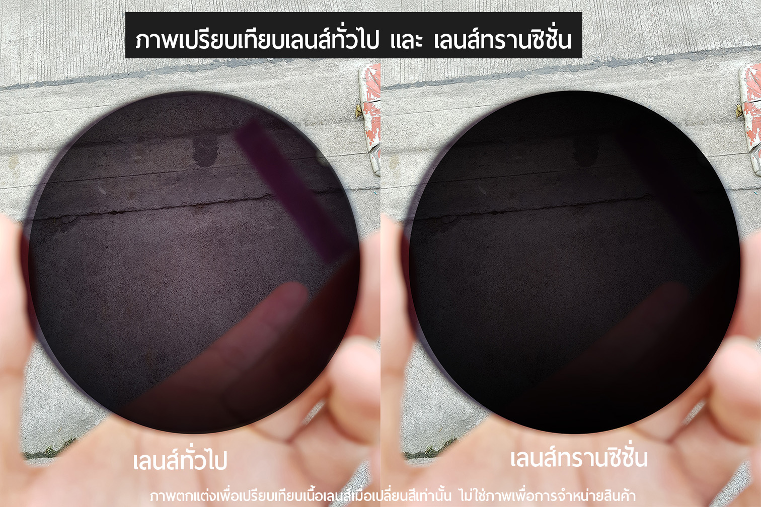 - Transition coating เป็นการนำสารเปลี่ยนสีไปเคลือบใว้บนผิวเลนส์ ทำให้เลนส์นั้นเข้มเสมอกันทั้งแผ่น ไม่ว่าสายตาจะสั้นมาก สั้นน้อย เข้มดำเท่ากัน รวมถึงการเปลี่ยนสีของเลนส์ที่รวดเร็ว และยังมีความเข้ม ดำ สวยกว่าแบบธรรมดามากๆ