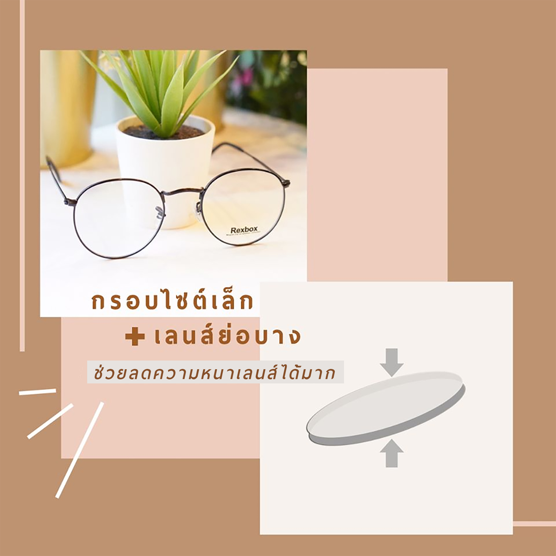 เคล็ดลับที่ 2 เลือกกรอบให้เล็กลง ลดความแฟชั่นลงบ้าง เลือกขนาดให้เหมาะสม ช่วยลดความหนาเลนส์ได้เยอะเลยทีเดียว ขนาด size เลนส์ที่แนะนำ 48 - 52 mm เป็นขนาดที่กำลังดี รองรับค่าสายตามากๆได้ ช่วยให้แว่นตาดูไม่หนาเทอะทะจนเกินไป ใช้คู่กับเลนส์ย่อบางจะช่วยทวีคูณความบางได้ยิ่งขึ้น