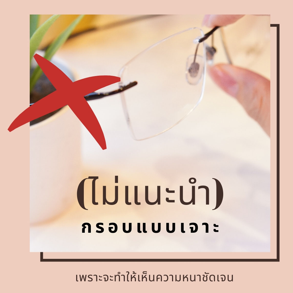 เคล็ดลับที่ 3 " ไม่ควรเลือกเป็นกรอบเจาะ" แม้ร้านแว่นตาจะบอกว่ากรอบเจาะเบาที่สุดในโลก ! แต่อย่าลืมว่าเราสายตาสั้นมาก หากใช้คู่กับกรอบเจาะ จะเห็นความหนาของเลนส์ชัดเจนเลยทีเดียว .. กรอบเจาะ เป็นกรอบแว่นที่ไร้ขอบ กรอบเปลือยไร้สิ่งใดมาปกปิด ดังนั้นจะเห็นขอบแว่นอย่างชัดเจน หากสายตาสั้นไม่มากนักก็ใช้ได้ " แต่สั้นเกิน -3.00 ไม่ขอแนะนำให้ใช้ " ลองพิจารณากรอบแบบอื่นดูก่อนครับ