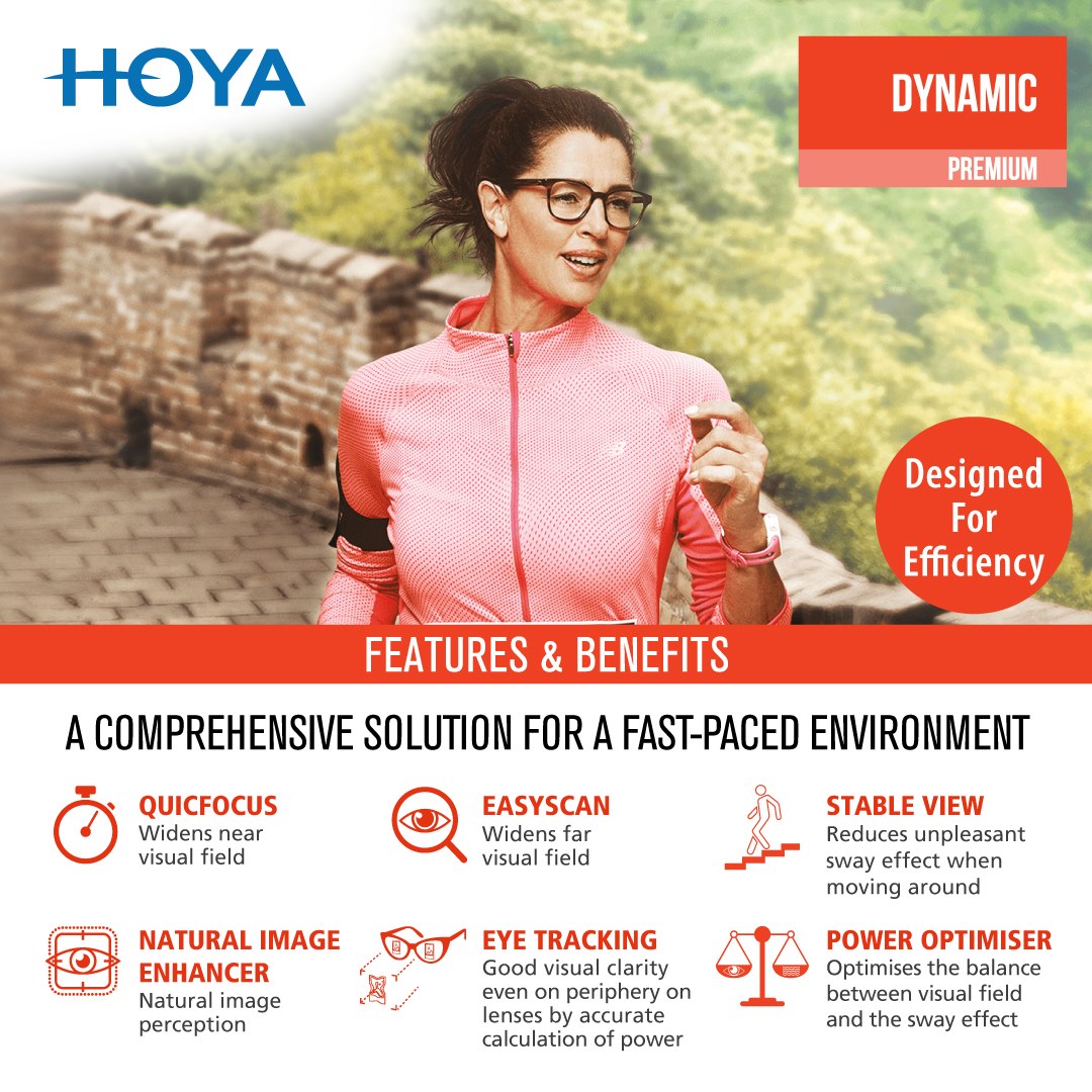 HOYA DYNAMIC PREMIUM เลนส์โปรเกรสซีฟโฮย่า นุ่มนวล ชัดเจนในทุกระยะแนะนำเป็นพิเศษสำหรับผู้ที่มีกิจกรรม เคลื่อนไหวตลอดทั้งวัน ตัวเลนส์ถูกขัดด้วย Hoya Dynamic technologyเพื่อการกวาดตาลงเพื่อออ่านหนังสือ ได้ธรรมชาติและ ปรับโฟกัสได้ง่ายกว่า โดย Hoya Dynamic technology ประกอบไปด้วย